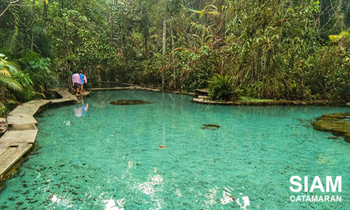 ที่งดงามเป็นบ่อน้ำสีฟ้าอมเขียวและมีพื้นเป็นทรายตะกอนหินปูน จึงทำให้น้ำมีความใสวิ๊ง เหมือนกับกำลังส่องกระจกอยู่ ทำให้ดู
